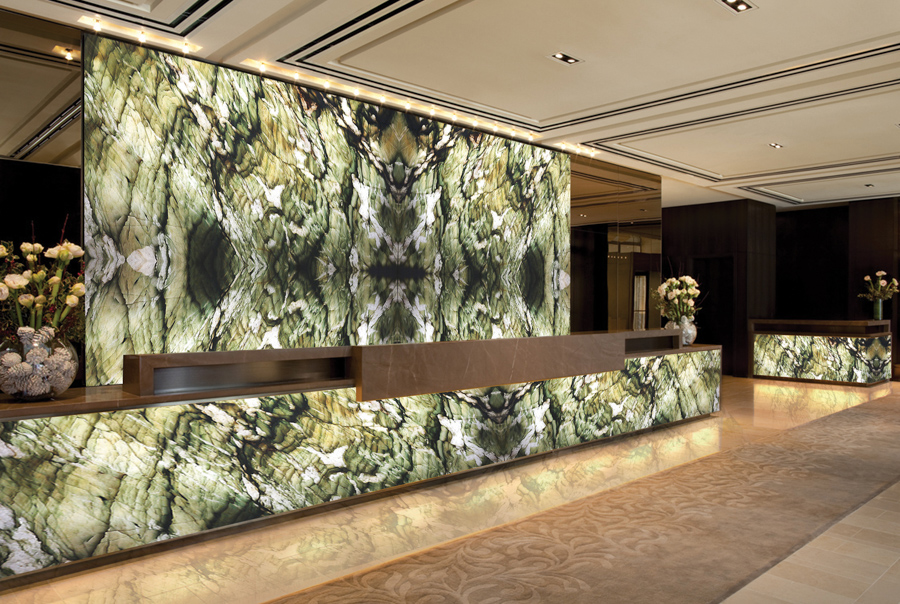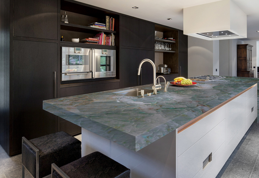 Wielość odmian kamieni naturalnych to dowód na to, że natura potrafi zaskakiwać. Nowy kwarcyt w ofercie firmy Interstone jest tego doskonałym przykładem. Alexandrite to kamień, na którym mieszają się ze sobą przeróżne odcienie zieleni – szmaragdowy, morski, butelkowy, które momentami przechodzą w złoto, a nawet kolor dojrzałego wina. Stonowana całość układa się w wyjątkową kompozycję, która po podświetleniu nabiera intensywności i zupełnie zmienia swój charakter. W zależności od efektu – jaki chcemy uzyskać – można pozostawić go w naturalnej kolorystyce lub podświetlić, uwydatniając grę i zmienność odcieni. Alexandrite wpisze się we wnętrza klasyczne, a w tych nowoczesnych i monochromatycznych będzie stanowił ciekawy i wyrazisty akcent kolorystyczny.