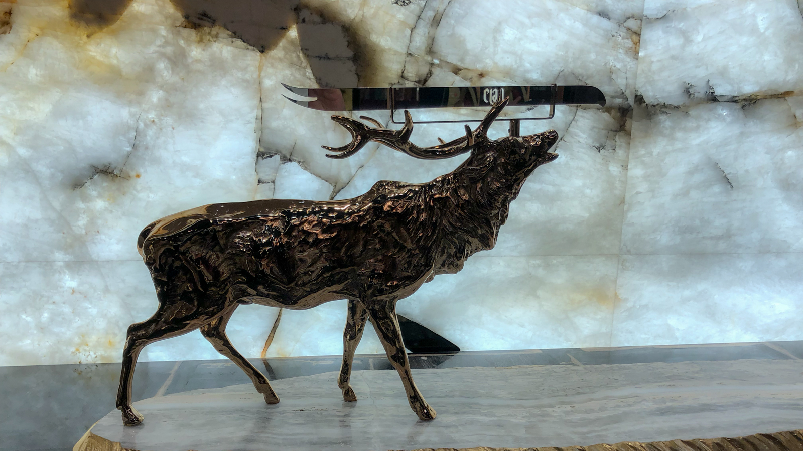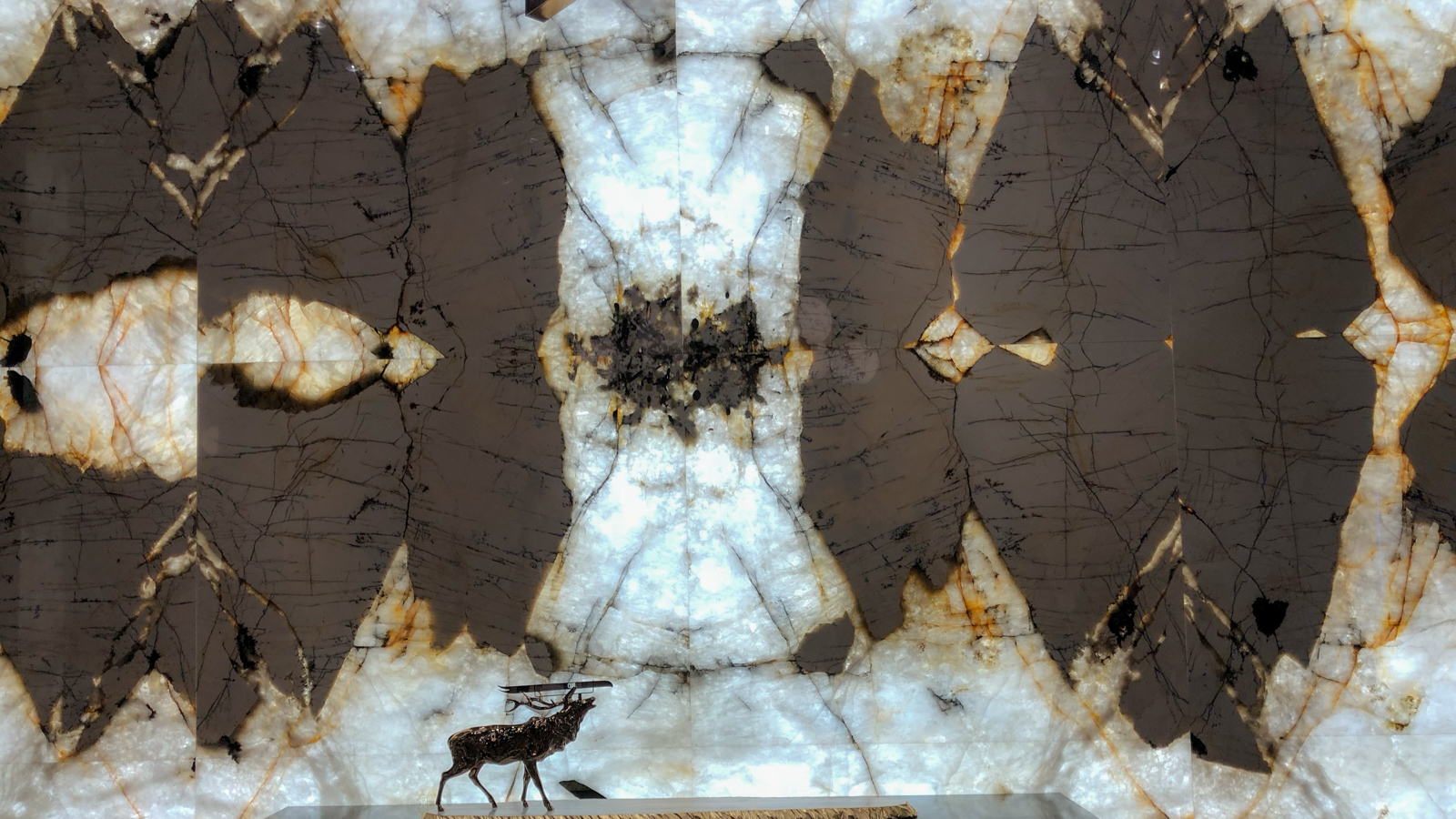 Patagonia to rzadka, egzotyczna odmiana kwarcytu o licznych prześwitach i ferii odcieni. Delikatna kremowo-beżowa baza łączy się tu ze srebrnymi i czarnymi minerałami, tworząc wyjątkowe, jedyne w swoim rodzaju rysunki użylenia. Najciemniejsze z nich to wykorzystywane w sztuce jubilerskiej Turmaliny, nazywane także kamieniem potężnej mocy, gdyż jak dawniej wierzono – oczyszczają ciało i umysł oraz chronią przed negatywnymi emocjami. Całość wzbogacona dużymi fragmentami kryształu górskiego układa się w unikalną kompozycję, która po podświetleniu nabiera efektownego, ekskluzywnego charakteru.