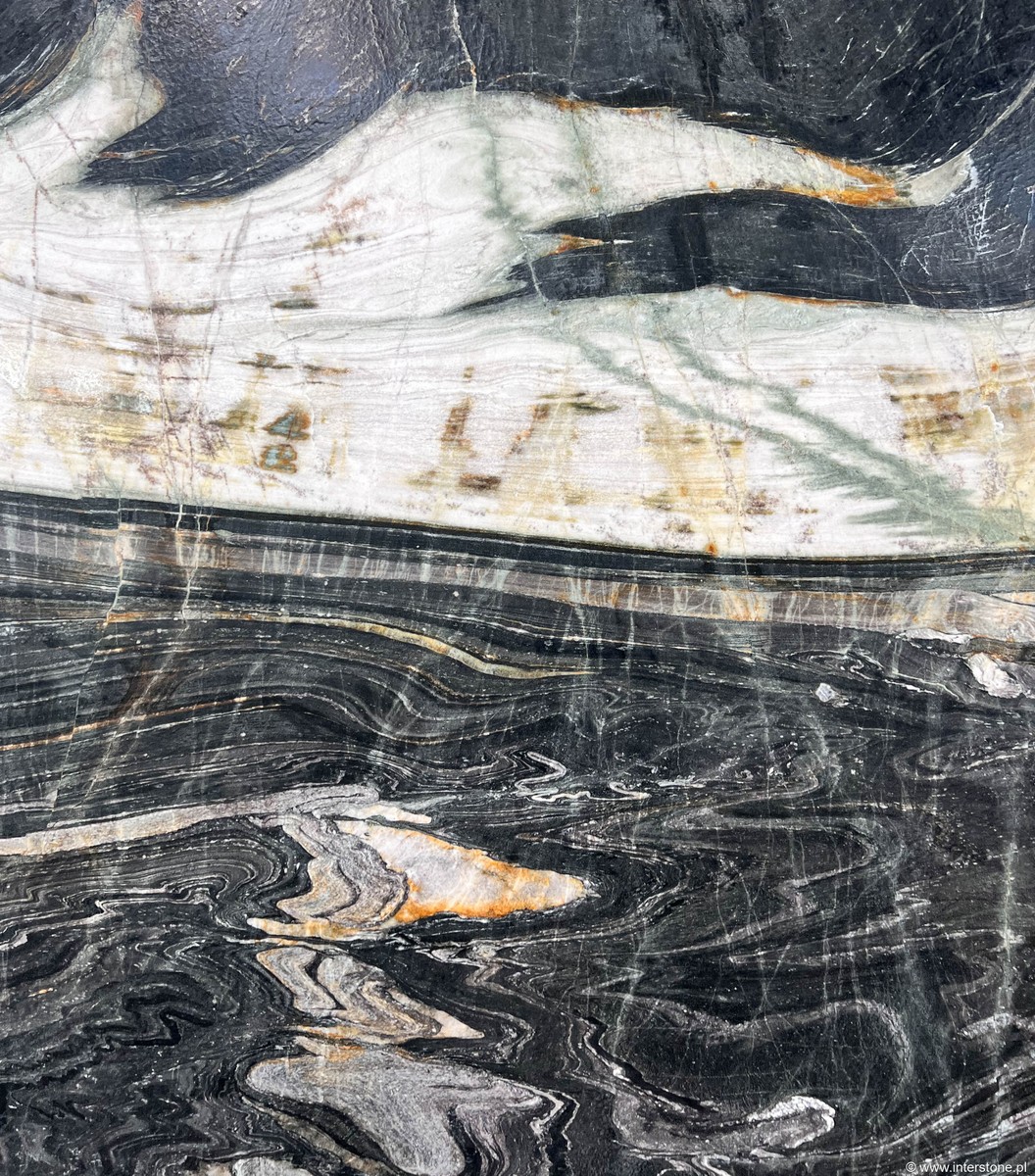 Indyjski kwarcyt Amalfi prezentuje wyrazisty, użyłony rysunek i szczotkowane wykończenie, które podkreśla głęboką czerń i surową elegancję. / Ten kwarcyt, zbudowany głównie z kwarcu (SiO2), osiąga twardość około 7 w skali Mohsa, co czyni go wyjątkowo odpornym na zarysowania i ścieranie. Materiał dostępny jest w grubościach 2 i 3 cm i sprawdza się zarówno we wnętrzach, jak i na zewnątrz. Amalfi wykazuje odporność na wilgoć, wysokie temperatury i działanie kwasów, dzięki czemu znajduje zastosowanie na blatach kuchennych, posadzkach, schodach, obudowach kominków, parapetach, tarasach, elewacjach oraz przy zabudowie basenów i fontann. Jego szczotkowana powierzchnia łączy estetykę z praktycznością. Dzięki twardości przewyższa stal hartowaną i nóż kuchenny; niektóre płyty wykazują przepuszczalność światła, co umożliwia efektowne podświetlenia i rzeźby. Materiał łączy wygląd z praktycznymi zaletami użytkowania.