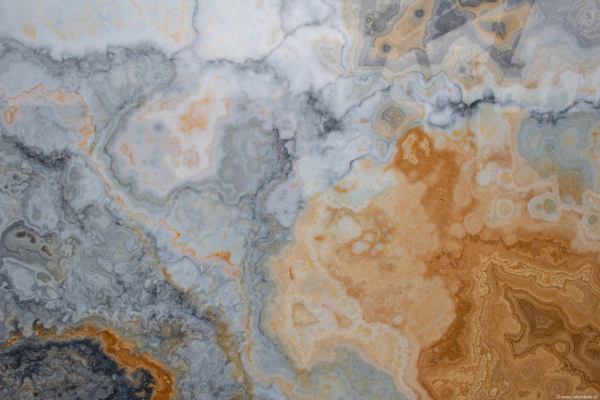 Blue Onyx to luksusowy onyks pochodzący z Iranu, jeden z najbardziej spektakularnych kamieni dekoracyjnych. Jego głęboki błękit – od jasnego nieba po morskie tony – przeplatany jest białymi, szarymi, żółtymi i pomarańczowymi żyłami, układającymi się w faliste, ogniste wzory. Dzięki wysokiej przepuszczalności światła płyty o grubości 2 i 3 cm po podświetleniu zamieniają się w efektowne instalacje świetlne na ścianach, blatach czy kolumnach. Polerowane wykończenie potęguje blask i głębię koloru. Co ciekawe, przy twardości 6,5–7 w skali Mohsa zarysuje szkło, a sam nie powinien ulec nawet stalowemu nożowi. W praktykach holistycznych w 2025 roku uznawany jest za „kamień koncentracji” – ma sprzyjać wyciszeniu, harmonii i twórczemu skupieniu