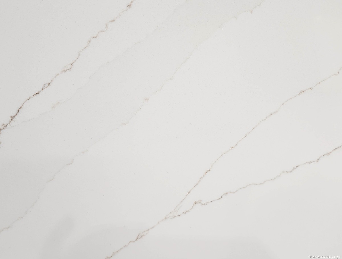 Calacatta Bella to elegancki, beżowy konglomerat kwarcowy o polerowanym wykończeniu, doskonały wybór na blaty kuchenne, łazienkowe oraz okładziny ścienne i podłogowe. / Ten konglomerat naśladuje naturalny marmur Calacatta poprzez delikatne szare i złote żyłki na jasnym tle. Materiał jest dostępny w grubości 2 cm. Charakteryzuje się twardością 7 w skali Mohsa, odpornością na plamy, zarysowania oraz temperaturę do 150°C, dzięki czemu sprawdza się w intensywnie użytkowanych wnętrzach. W przeciwieństwie do naturalnego marmuru nie wymaga impregnacji, jest nieporowaty i ogranicza przenikanie wilgoci oraz bakterii. Wzór inspirowany Marmurem z Carrary pojawia się w prestiżowych wnętrzach, podkreślając elegancję i ponadczasowy charakter. Znajduje szerokie zastosowanie w hotelach, lokalach gastronomicznych, centrach odnowy i SPA.