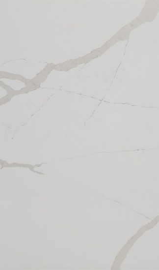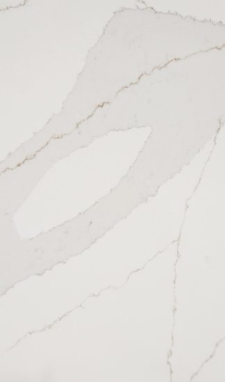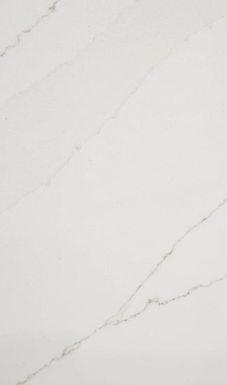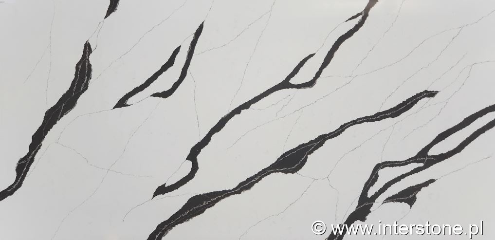 Calacatta Black to nowoczesny konglomerat o kremowo-beżowym, użylonym wzorze i polerowanym wykończeniu, łączący wyrafinowaną estetykę z praktycznością. / Ten konglomerat kwarcowy charakteryzuje się głęboką, kremowo-beżową powierzchnią z wyraźnymi żyłkami. Materiał ma grubość 2 cm i w większości swojego składu zawiera naturalny kwarc osadzony w żywicy, co skutkuje twardością 6-7 w skali Mohsa. Powierzchnia jest nieporowata, odporna na ścieranie, kwasy, dzięki czemu doskonale sprawdza się jako blaty kuchenne, blaty łazienkowe, lady, podłogi oraz okładziny ścienne. Jest trudniejszy do zarysowania niż stal, wykazując odporność na zarysowania typową dla konglomeratów kwarcowych. Sprawdza się w intensywnie użytkowanych przestrzeniach. Jest nowoczesnym materiałem, cenionym za trwałość i łatwość w codziennej pielęgnacji.