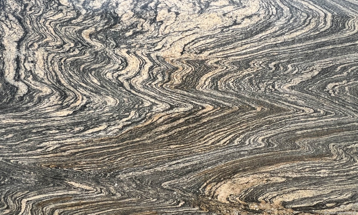 Indyjski granit o egzotycznej, wielokolorowej strukturze, przypominającej skórę węża. Cobra Gold z oferty Interstone to luksusowy materiał, który wprowadza do wnętrz dynamikę i ciepło, idealny dla prestiżowych przestrzeni. / Ten wyjątkowy kamień charakteryzuje się ciepłą, złocisto-brązową barwą, wzbogaconą unikalnym układem żyłkowania i zróżnicowaną strukturą, która sprawia, że każda płyta jest niepowtarzalna. Polerowane wykończenie nadaje powierzchni elegancki połysk, podkreślający głębię i bogactwo kolorystyczne kamienia. Dostępny w grubościach 2 i 3 cm, doskonale sprawdza się w reprezentacyjnych realizacjach – od efektownych podłóg i ścian w lobby hotelowych, po luksusowe blaty i elementy dekoracyjne w rezydencjach. Cobra Gold to wybór dla tych, którzy poszukują materiału o wyrazistym charakterze, który stanie się centralnym punktem aranżacji, dodając jej prestiżu i wyjątkowości.