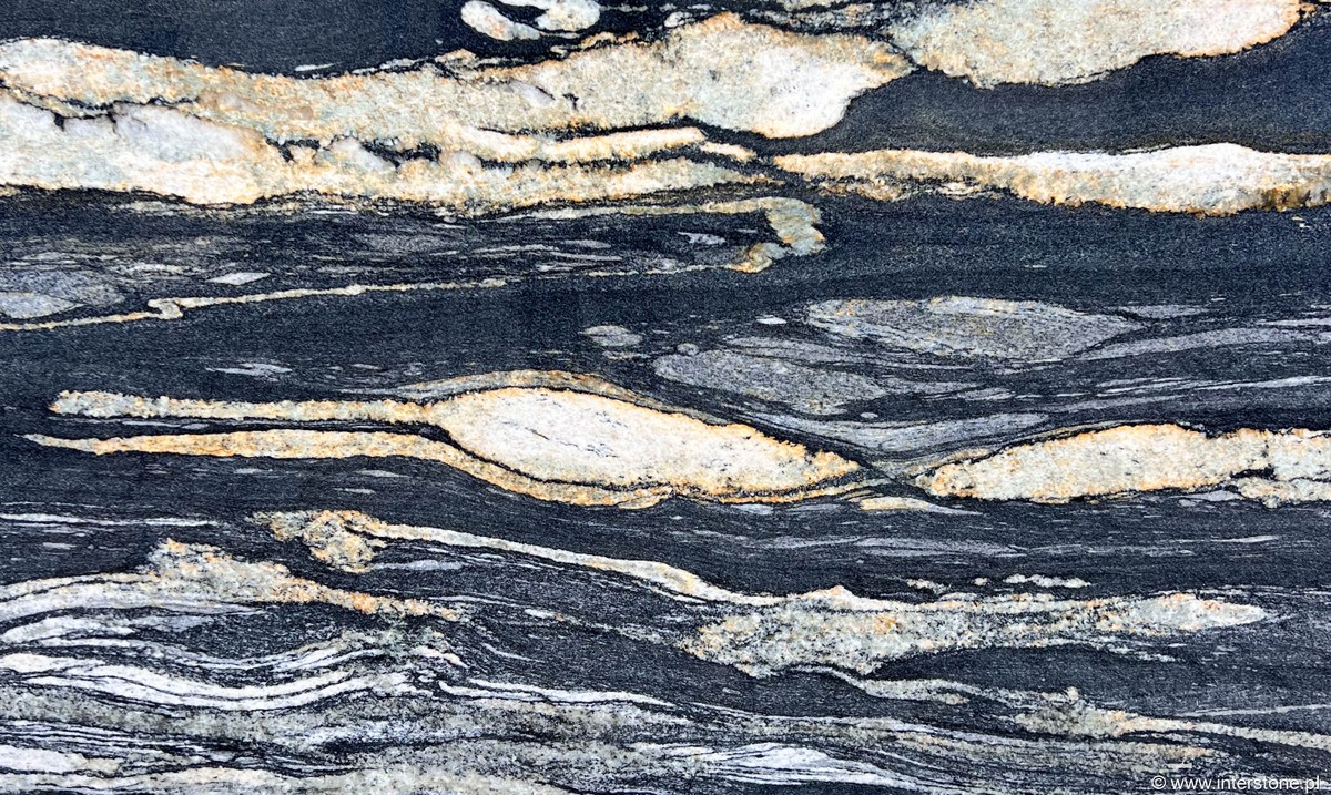 Indyjski granit o luksusowym charakterze i uniwersalnym zastosowaniu. Fusion Gold zachwyca czarnym tłem przeplatanym złotożółtymi i brązowymi żyłkami, a polerowane wykończenie podkreśla kontrasty. / Ten szlachetny kamień pochodzi z południowych Indii i wyróżnia się wysoką twardością 6–7 w skali Mohsa, co zapewnia odporność na zarysowania, wilgoć, wysokie temperatury i plamy. Dostępny jest w grubościach 2 i 3 cm oraz w płytach Jumbo, płytkach i blatach o grubości 15–30 mm. Czarny kolor z użyłonym wzorem wpisuje się w nowoczesne aranżacje, gdzie kamień pełni rolę eleganckiego akcentu we wnętrzach i na zewnątrz. Granit znajduje zastosowanie jako blaty kuchenne, podłogi, okładziny ścienne, schody, parapety, elewacje i tarasy, zachowując trwałość nawet przy intensywnej eksploatacji.