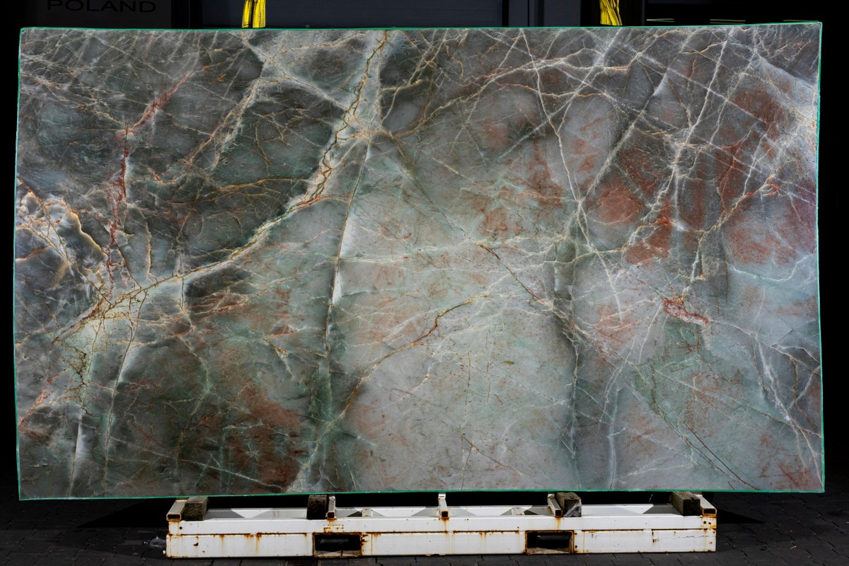 Jadore Green to efektowny kwarcyt o głębokiej butelkowej zieleni, polerowany, idealny tam gdzie liczy się wyrazisty, jubilerski wygląd. / Ten szlachetny kamień, wydobywany w Brazylii, łączy intensywną zieleń z seledynowymi tonami oraz złotymi i jasnokremowymi żyłkami, które nadają mu trójwymiarowy, biżuteryjny charakter. Dostępny w grubościach 2 i 3 cm, wykazuje twardość około 7 w skali Mohsa i dzięki temu jest wyjątkowo odporny na zarysowania, plamy, działanie kwasów oraz wysoką temperaturę. Polerowane wykończenie podkreśla kontrast żyłek i nadaje powierzchni elegancki połysk. Materiał doskonale sprawdza się jako blaty kuchenne i łazienkowe, okładziny ścienne, kominki, stoliki oraz elementy reprezentacyjnych wnętrz, łącząc spektakularny wygląd z praktycznymi zaletami. Wykorzystywany jest w reprezentacyjnych lobby, wyspach kuchennych, luksusowych łazienkach spa oraz w nowoczesnych rzeźbach i detalach architektonicznych i dekoracyjnych.