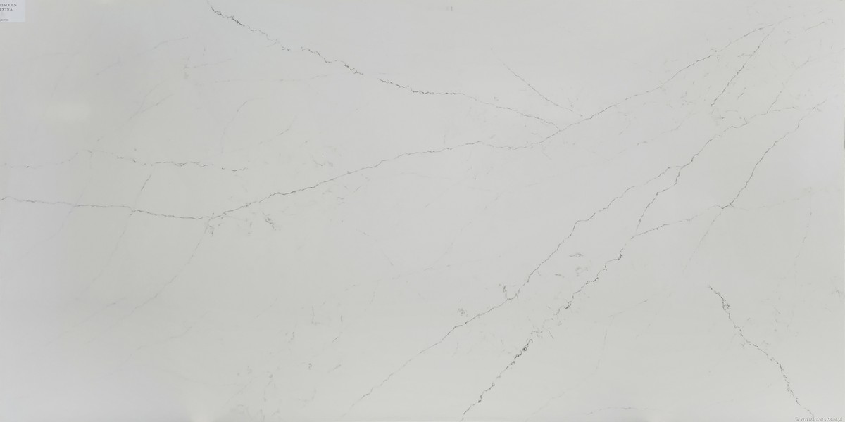 Lincoln White to elegancki biały konglomerat kwarcowy o polerowanym wykończeniu, doskonały wybór na funkcjonalne i reprezentacyjne powierzchnie. / Ten szlachetny konglomerat charakteryzuje się czystą białą barwą i wzorem delikatnej, cienkiej żyłki oraz jest dostępny w grubości 2 cm. Polerowane wykończenie nadaje powierzchni subtelny połysk i ułatwia utrzymanie czystości. Dzięki dominującemu udziałowi kwarcu materiał osiąga twardość około 7 w skali Mohsa, co przekłada się na wysoką odporność na zarysowania i plamy. Konglomeraty kwarcowe znajdują zastosowanie w nowoczesnych projektach architektonicznych, w tym luksusowych kuchniach hoteli i prestiżowych rezydencjach. Materiał jest ceniony za higieniczność, trwałość i elegancki, użyłowany charakter. Kwarc nawiązuje do tradycyjnych zastosowań, a przykłady jego częstych zastosowań obejmują m. in. blaty, parapety i okładziny ścienne.