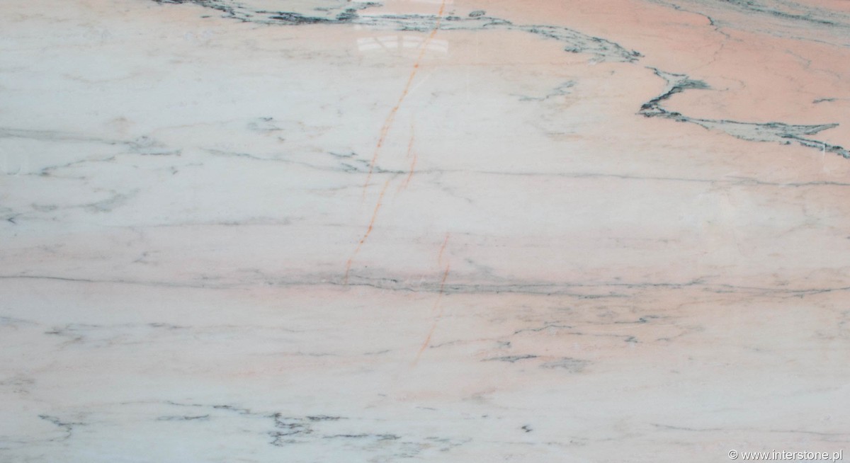 Wyjątkowy kamień pochodzący z portugalskich złóż, ceniony za charakterystyczną kolorystykę. Marmur Rosa Portogallo z kolekcji Interstone to materiał wyróżniający się na tle innych marmurów dostępnych na rynku. / Jest uznawany za narodowy marmur Portugalii. Charakteryzuje się delikatnym, różowym tłem z wyraźnymi białymi żyłkami i subtelnymi akcentami kolorystycznymi: od estremos (biały) po rosso (różowy), choć pośrednio znajdziemy w nim też bloki łososiowe, zielone, seledynowe i brzoskwiniowe. Szczotkowane wykończenie nadaje powierzchni matową fakturę, która redukuje refleksy świetlne i maskuje ślady codziennego użytkowania. Dostępny w grubości 2 i 3 cm, w optymalnym przedziale cenowym, sprawdza się w różnorodnych zastosowaniach wewnętrznych – blatach łazienkowych, kominkach, parapetach, posadzkach, schodach i okładzinach ściennych. Pastelowa kolorystyka doskonale komponuje się zarówno z nowoczesnymi, jak i klasycznymi wnętrzami, o czym mogą się przekonać m. in. osoby zwiedzające Pałac Buckingham w Londynie, gdzie użyto go w niektórych salach i pomieszczeniach.