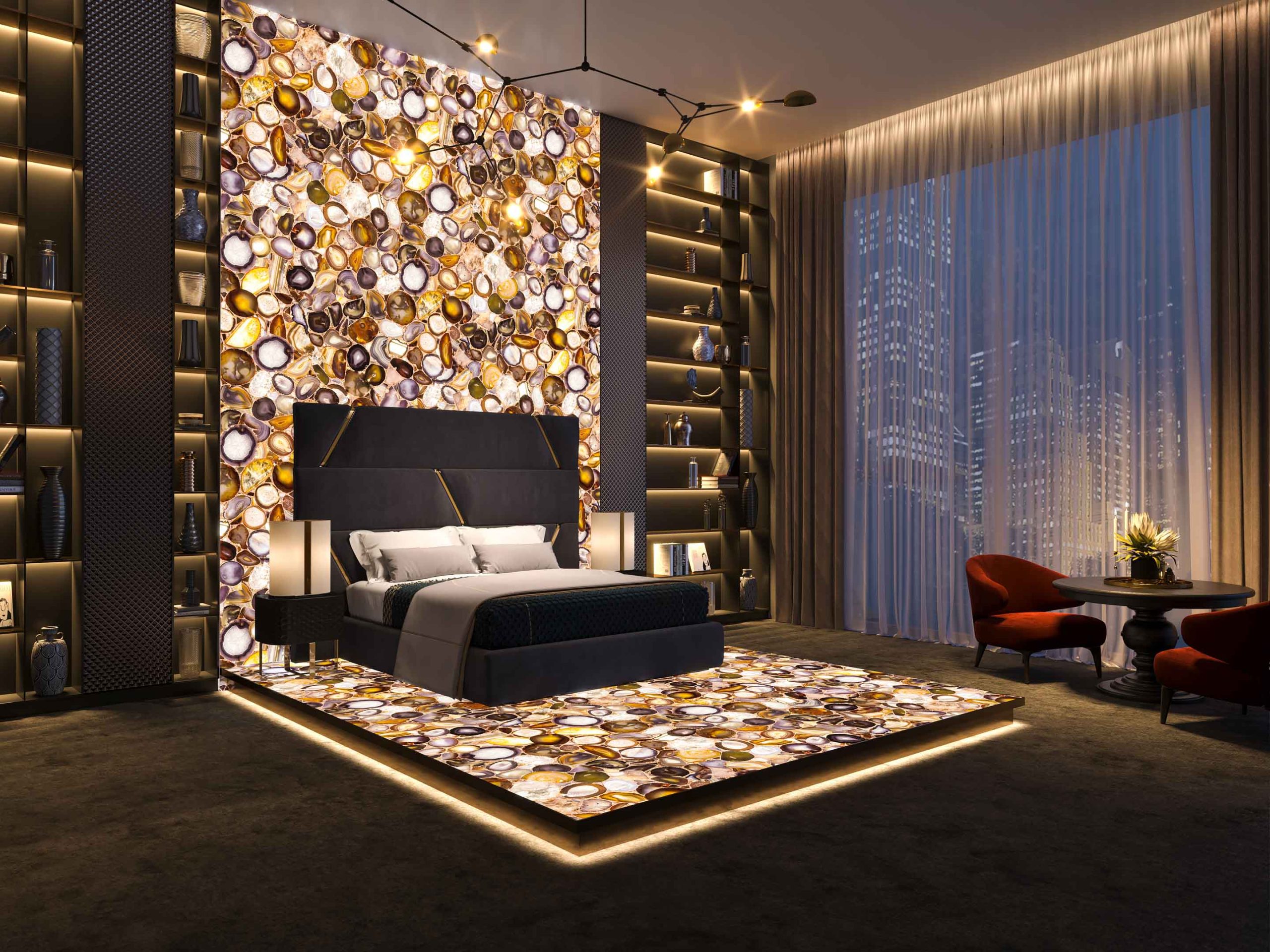 Agaty to jedne z najbardziej tajemniczych kamieni szlachetnych. Są odmianą chalcedonu, stąd wyróżniają się dużą twardością i wytrzymałością. Na zewnątrz niepozorne, nieciekawe, czasem nijakie. Całe piękno kryją w środku. Niepowtarzalna feeria barw i kilkuwymiarowe warstwy z cudnymi prześwietleniami sprawiają, że agaty we wnętrzach – odpowiednio oświetlone i wyeksponowane – zachwycająco się mienią. Architekci i projektanci wnętrz coraz częściej wykorzystują je jako materiał na blaty, posadzki, okładziny ścienne, ale także elementy dekoracyjne. Szeroki wachlarz aranżacyjny sprawia, że dostępne w ofercie Interstone agaty mogą być motywem przewodnim nowoczesnego salonu, kuchni otwartej na jadalnię czy pokoju kąpielowego, chociaż intensywność ich barw sprawia, że w nietuzinkowej recepcji hotelu czy ekskluzywnej strefie wellness i spa będą się prezentować równie dobrze. Ale to nie funkcjonalność, chociaż utrzymana na najwyższym poziomie, stanowi
