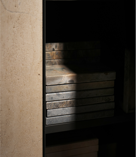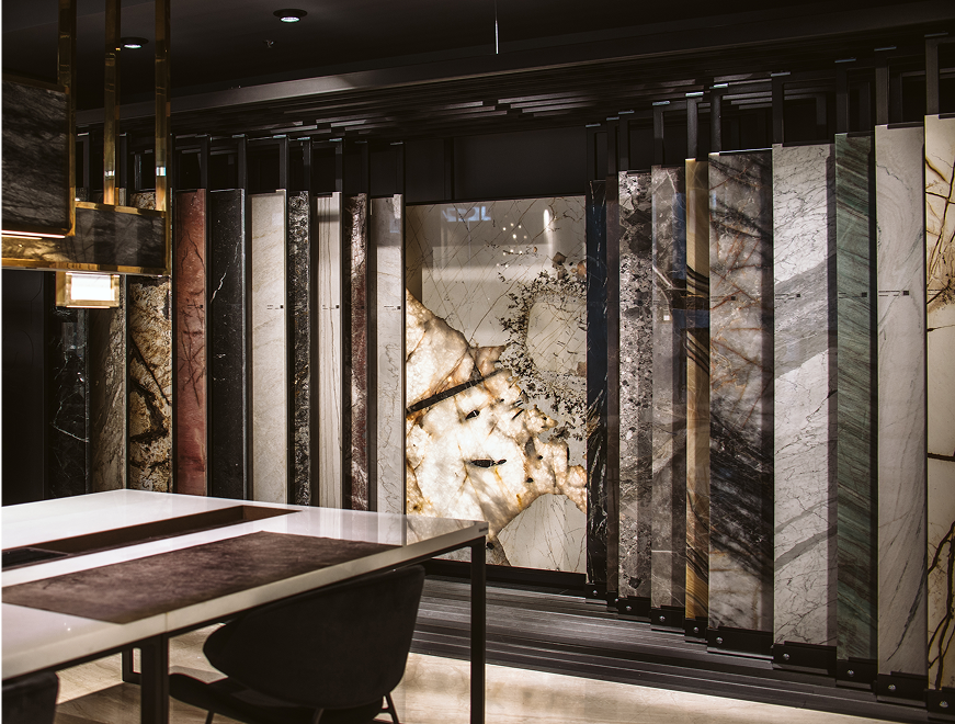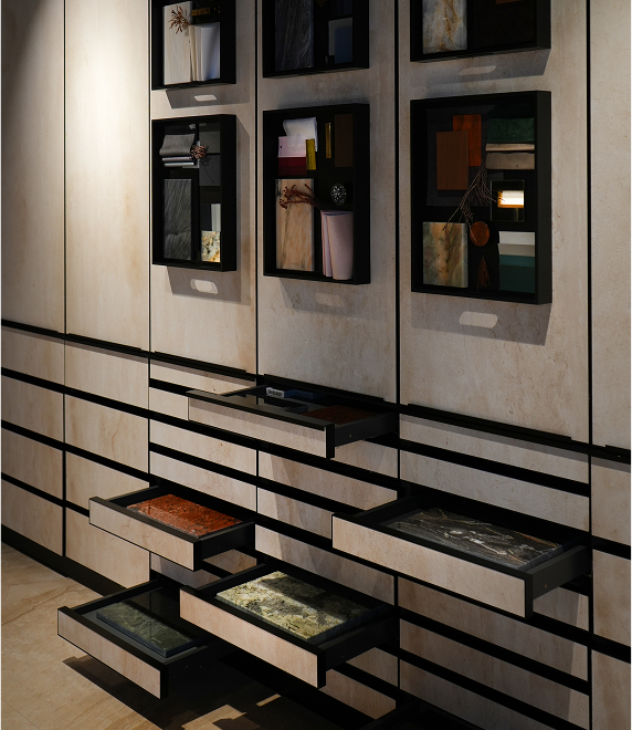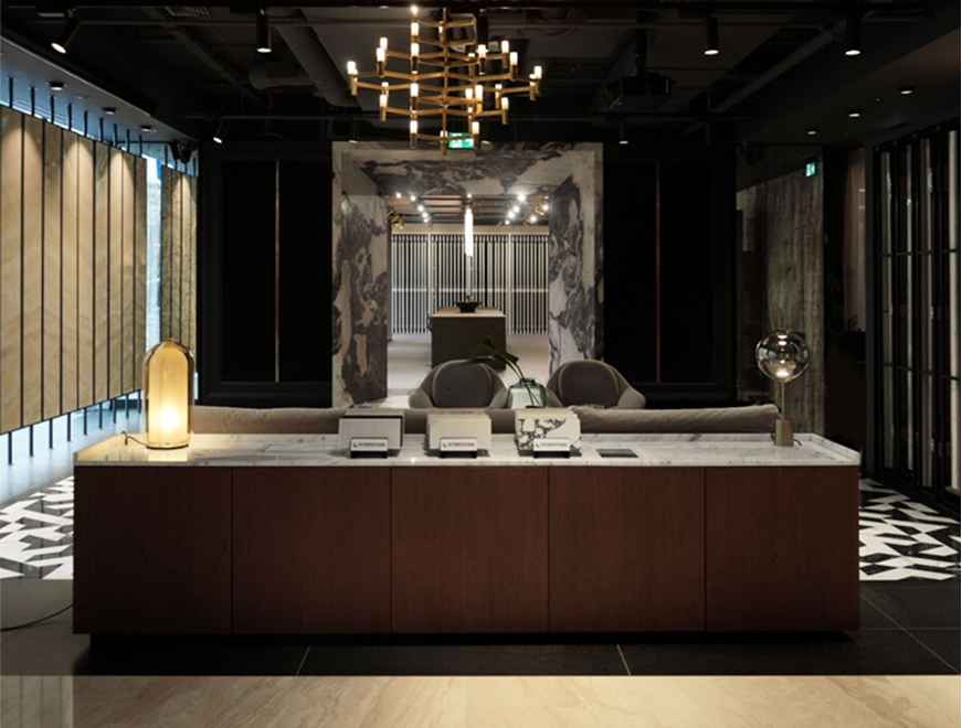 - Zaawansowane technologie multimedialne – ściana wideo 4K, aplikacja sterująca wszystkimi funkcjami showroomu oraz system prezentacji na bieżąco aktualizowanych materiałów z kamieniołomów. Centralnym punktem jest wyspa z obszernym blatem i przepastnymi szufladami pełnymi próbek.