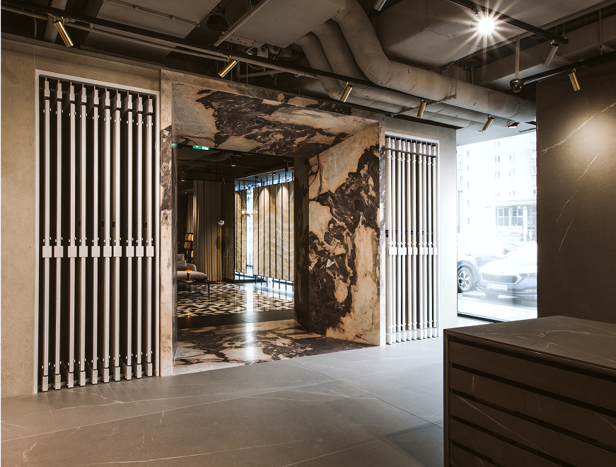 Monumentalny marmurowy portal łączy dwie wyjątkowe przestrzenie – świat kamieni naturalnych Interstone oraz innowacyjnych spieków kwarcowych Laminam. Showroom w warszawskim budynku Eurocentrum przy Alejach Jerozolimskich 132 to miejsce, gdzie można zobaczyć, dotknąć i doświadczyć materiałów zmieniających oblicze współczesnego designu. Zaprojektowany przez pracownię JMW Architekci, eksponuje najbogatszą w kraju gamę materiałów wykończeniowych premium.