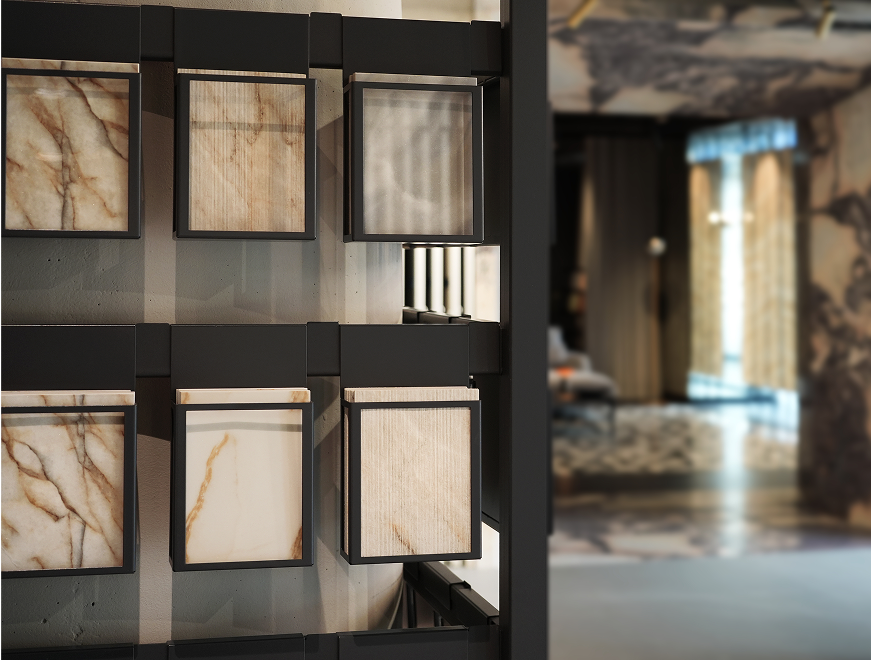 - Innowacyjne rozwiązania ekspozycyjne – obrotowe ekspozytory 360° pozwalające oglądać płyty w różnych warunkach oświetleniowych, lastroteca z ukośnie zamontowanymi panelami, prezentacja slabów w rozmiarze 270 cm wysokości oraz unikalna biblioteka z kolistymi elementami o średnicy 30 cm do tworzenia moodboardów.