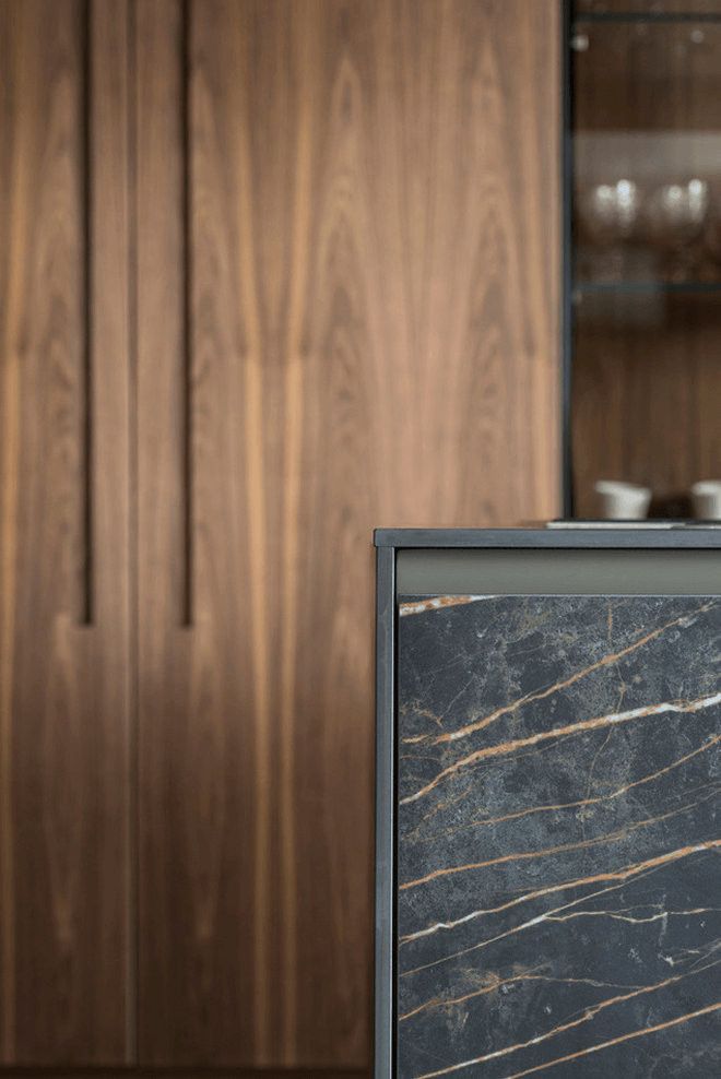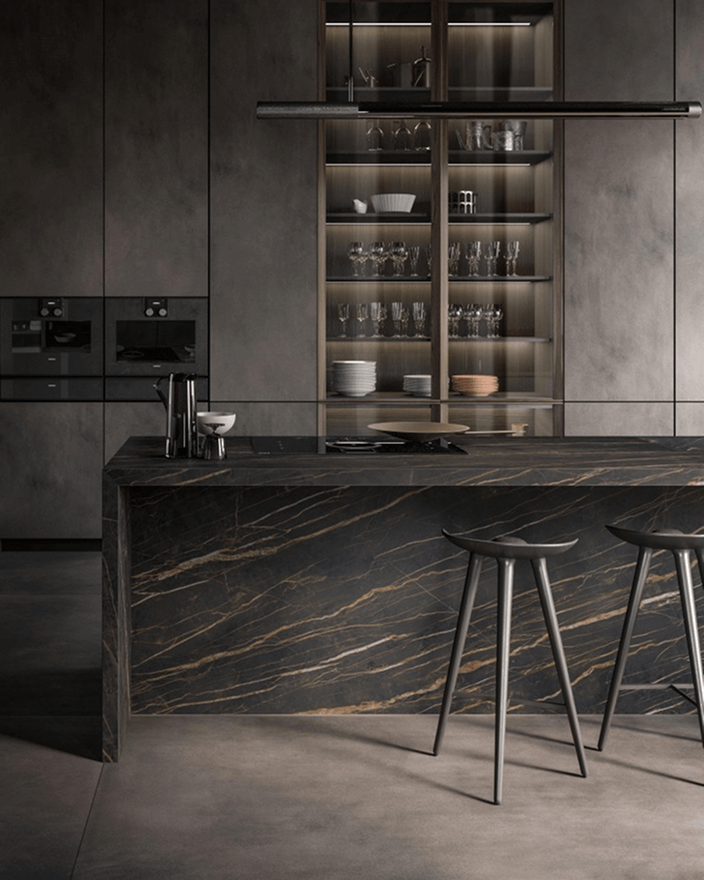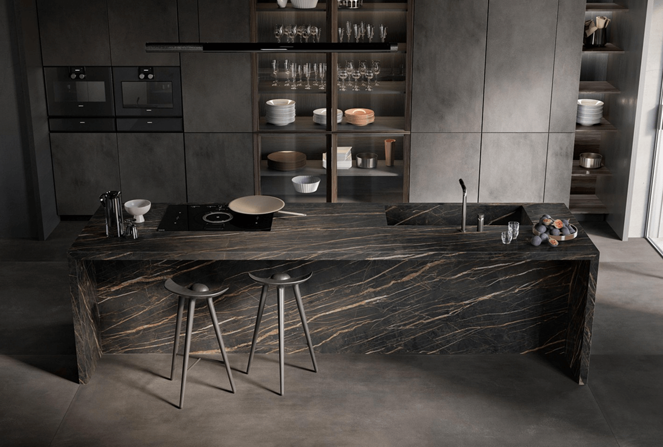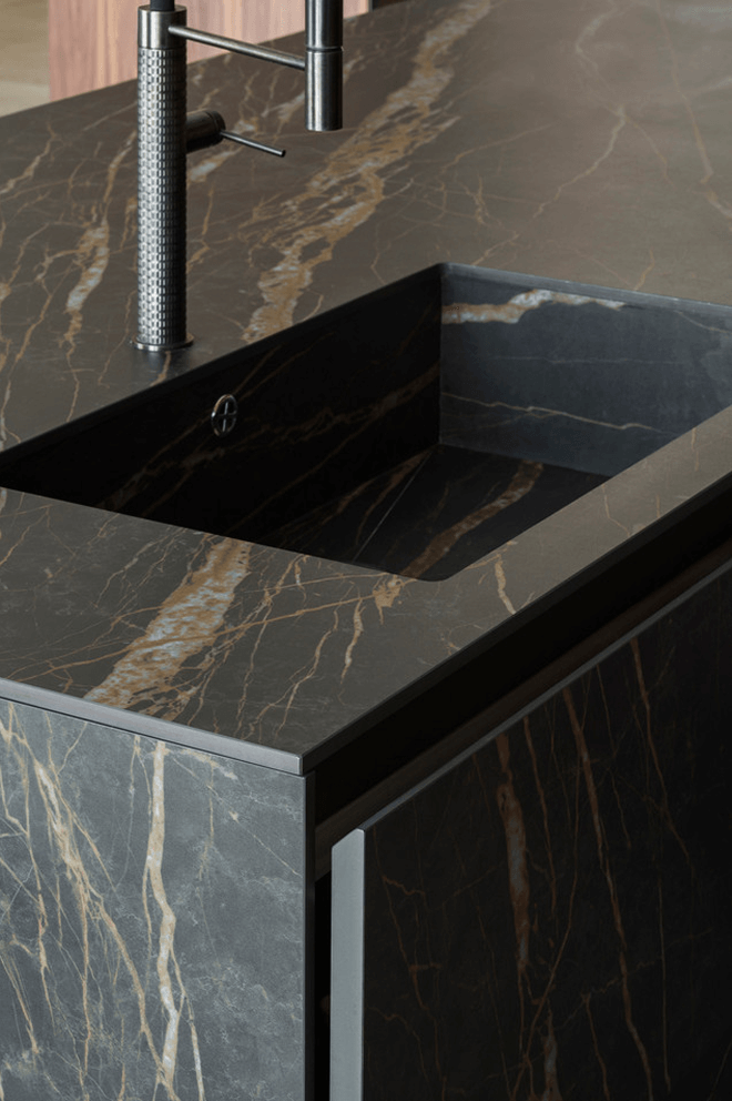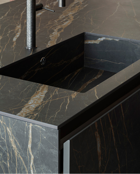 4. Nieograniczone możliwości projektowe – od klasycznych, prostych form, po fantazyjne kształty i wykończenia. Materiały kamienne można formować w dowolny sposób, tworząc zaokrąglenia, podcięcia czy zintegrowane zlewy. Kamień naturalny i konglomeraty posiadają przechodzące żyły w całym przekroju płyty. W kolekcji In-Side od Laminam dostępne są kolory, które cechują się przechodzeniem wzoru w grubości materiału – projektant ma więc swobodę aranżowania np. frezowań pod ociekacze. W pozostałych kolekcjach płyty są barwione w masie. Możliwość wykonania blatów o różnej grubości – od masywnych, kilkucentymetrowych płyt po ultracienkie spieki – pozwala dopasować styl do charakteru wnętrza. Spieki kwarcowe Laminam w formacie XL 1620 x 3240 mm i grubości 12+ mm są dedykowane do blatów kuchennych i łazienkowych, dając jeszcze jedną unikalną możliwość – można stosować je również jako cienką okładzinę ścienną między szafkami kuchennymi oraz jako materiał na fronty kuchenne.