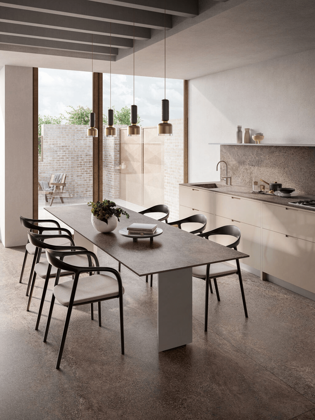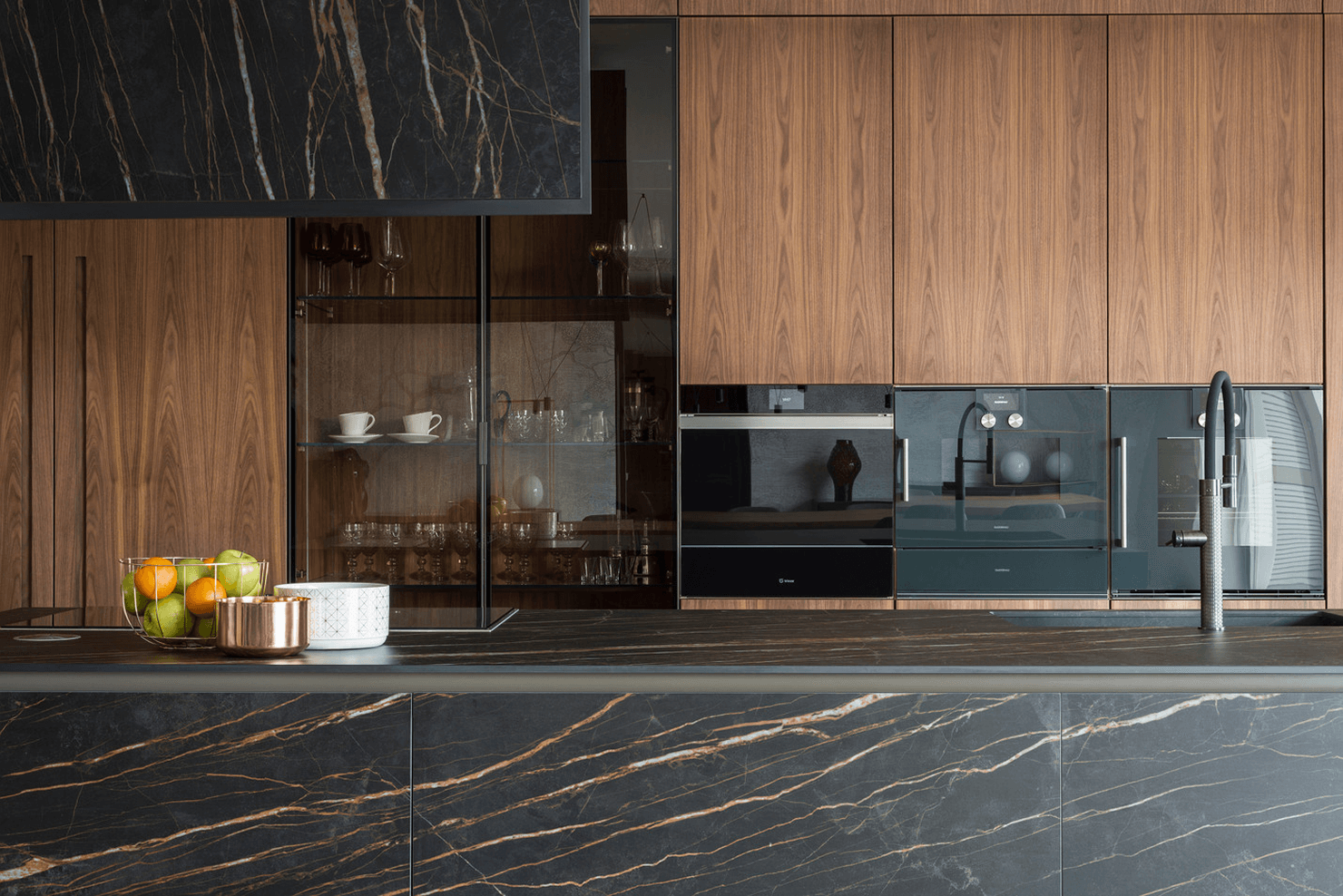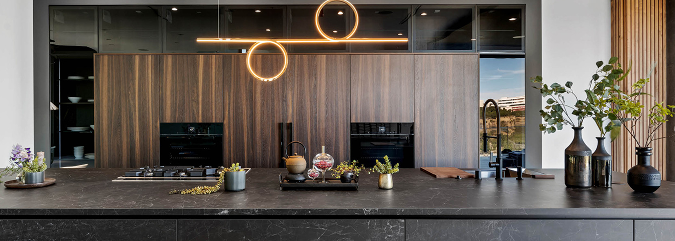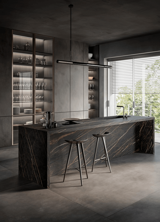 4. Nieograniczone możliwości projektowe – od klasycznych, prostych form, po fantazyjne kształty i wykończenia. Materiały kamienne można formować w dowolny sposób, tworząc zaokrąglenia, podcięcia czy zintegrowane zlewy. Kamień naturalny i konglomeraty posiadają przechodzące żyły w całym przekroju płyty. W kolekcji In-Side od Laminam dostępne są kolory, które cechują się przechodzeniem wzoru w grubości materiału – projektant ma więc swobodę aranżowania np. frezowań pod ociekacze. W pozostałych kolekcjach płyty są barwione w masie. Możliwość wykonania blatów o różnej grubości – od masywnych, kilkucentymetrowych płyt po ultracienkie spieki – pozwala dopasować styl do charakteru wnętrza. Spieki kwarcowe Laminam w formacie XL 1620 x 3240 mm i grubości 12+ mm są dedykowane do blatów kuchennych i łazienkowych, dając jeszcze jedną unikalną możliwość – można stosować je również jako cienką okładzinę ścienną między szafkami kuchennymi oraz jako materiał na fronty kuchenne.
