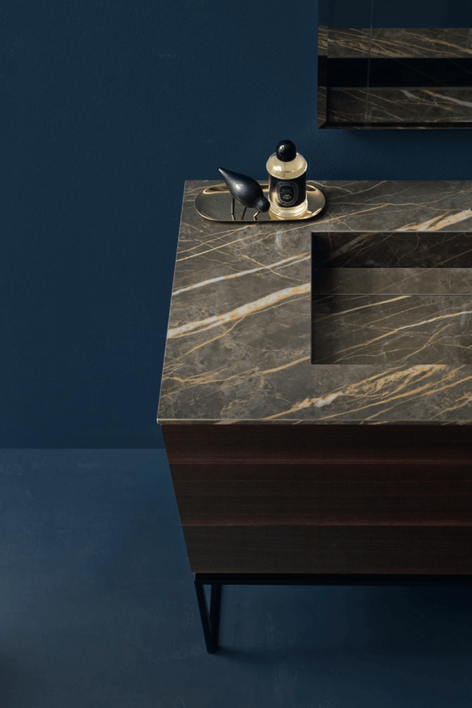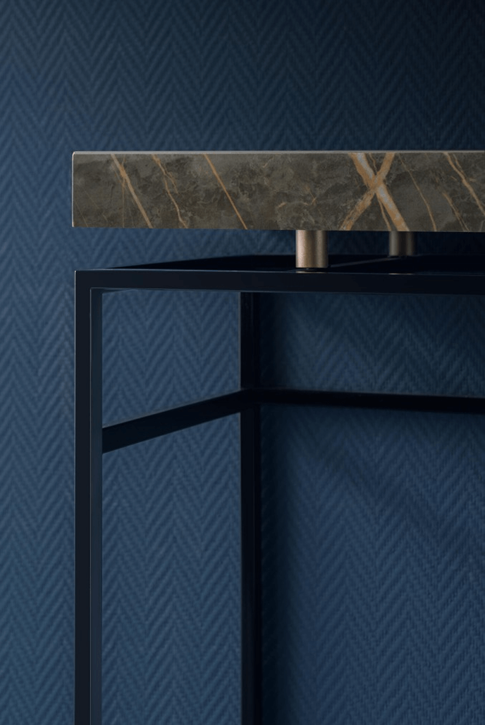 2. Niepowtarzalność każdego egzemplarza – żyłkowanie marmuru Calacatta czy Carrara, krystaliczna struktura granitu czy organiczne wzory onyksów sprawiają, że każdy mebel z elementami z kamienia naturalnego jest absolutnie unikalny. Półszlachetny kamień Agata Blue, odpowiednio podświetlony, wspaniale zdobi meble, niczym najdroższa biżuteria. Spieki kwarcowe Laminam z kolekcji I Naturali doskonale imitują kamienie naturalne, oferując podobne walory estetyczne przy większej przewidywalności wzoru. Konglomeraty InterQ zapewniają jednolitą strukturę, idealną do minimalistycznych projektów. Nawet meble z tej samej kolekcji i z tego samego materiału będą się subtelnie różnić, co w czasach masowej produkcji stanowi wartość nie do przecenienia.