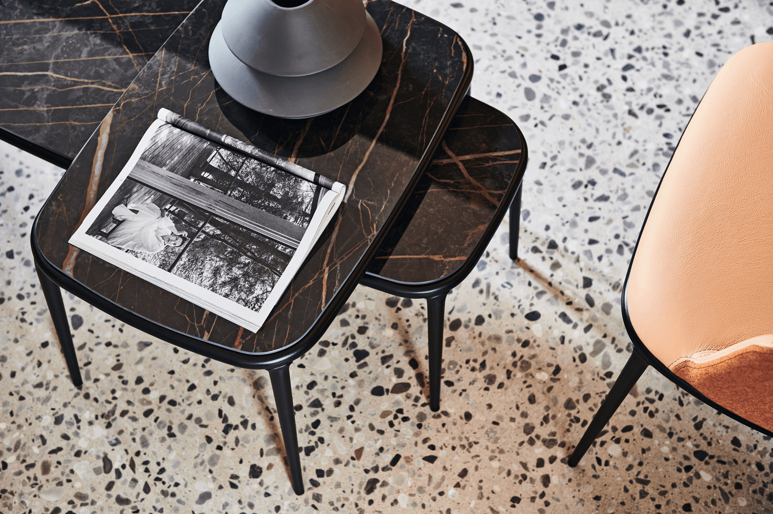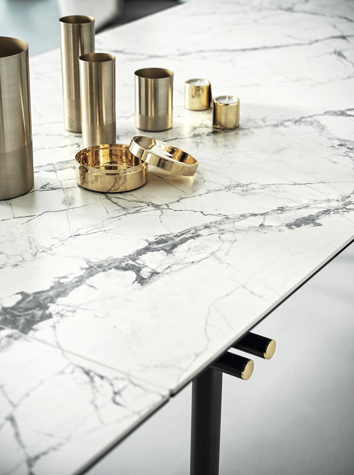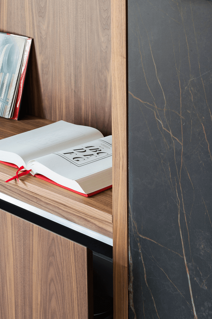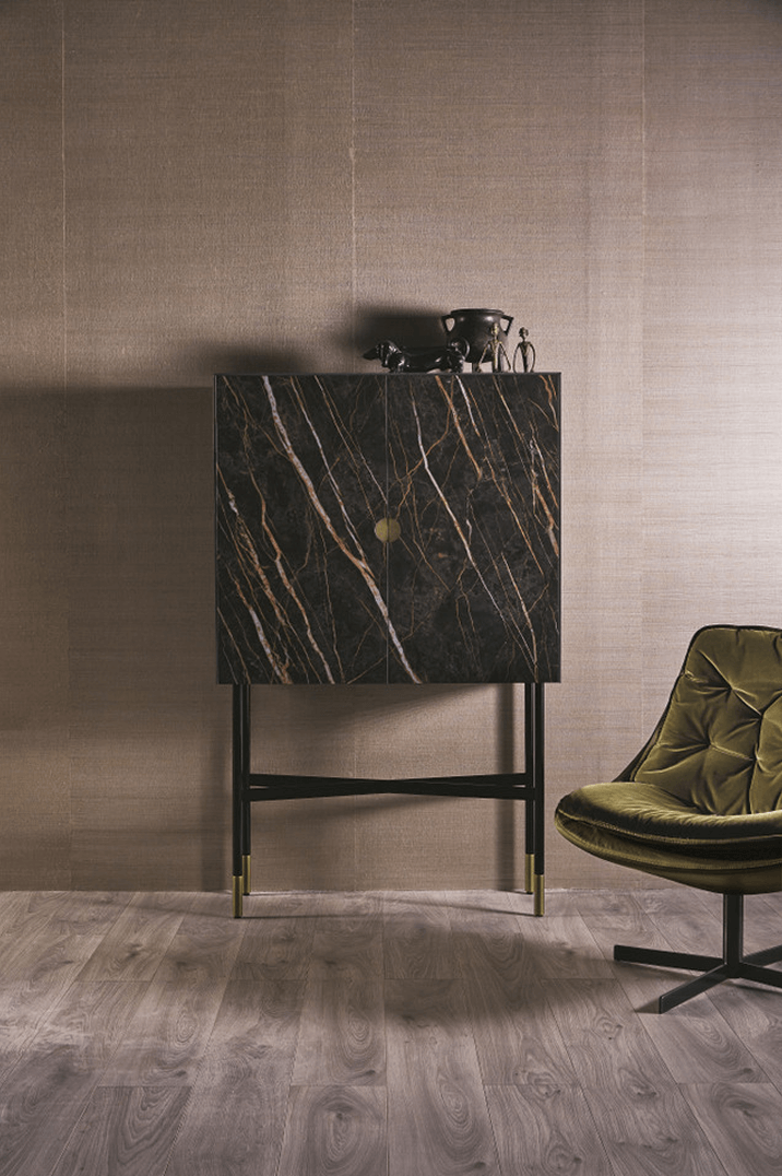 5. Mistrzowskie połączenie z innymi materiałami – materiały z oferty Interstone doskonale komponują się z drewnem, metalem, szkłem czy skórą, tworząc meble o wyjątkowym charakterze. Stół z drewnianymi nogami i marmurowym blatem, komoda z metalową ramą i frontami ze spieku kwarcowego Laminam, regał łączący szkło z granitowymi elementami – te zestawienia tworzą fascynujące napięcie między różnymi fakturami i właściwościami materiałów. Spieki kwarcowe Laminam z kolekcji Legno Venezia doskonale imitują drewno, pozwalając na tworzenie spójnych wizualnie kompozycji z prawdziwym drewnem, ale o znacznie lepszych parametrach technicznych.