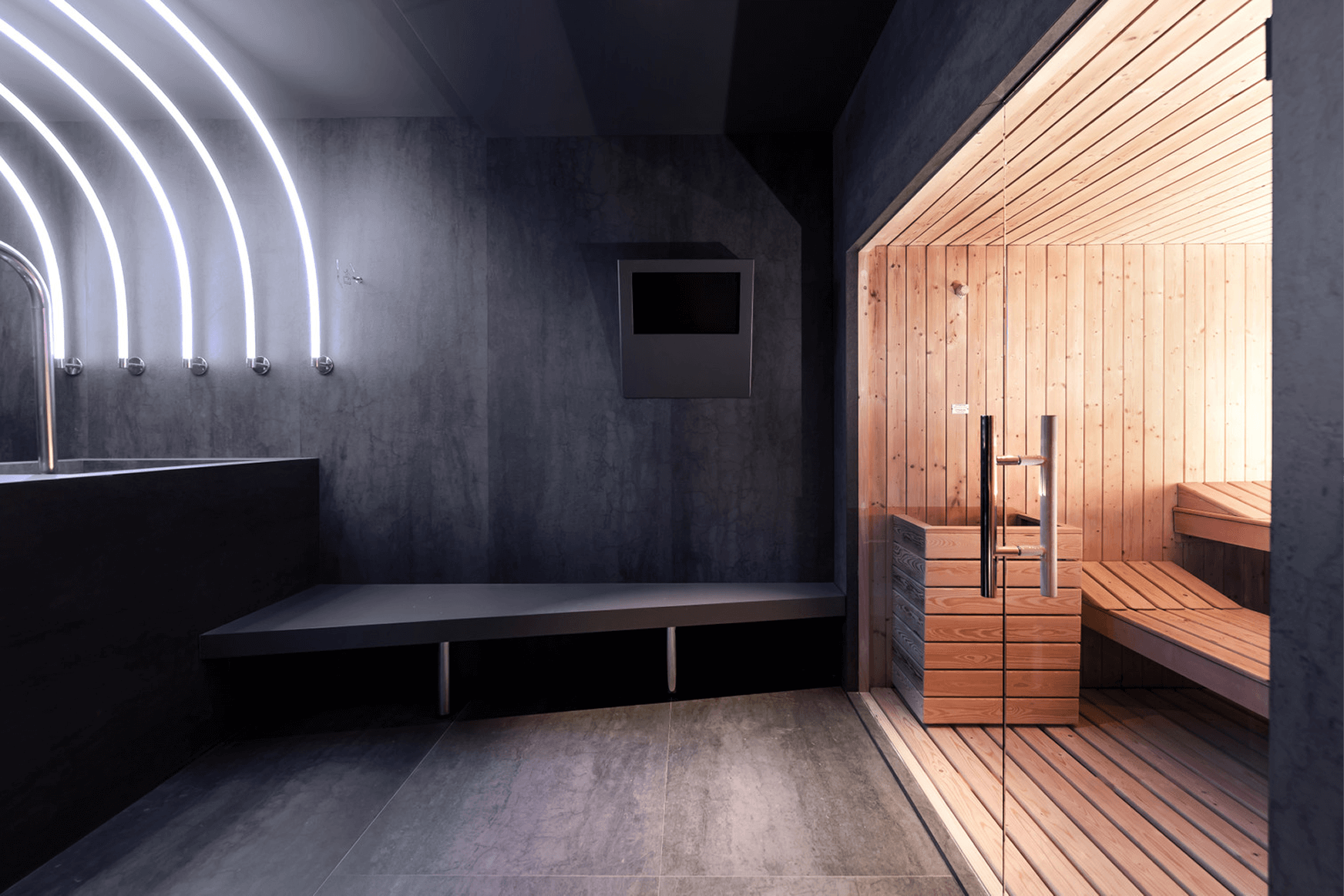 5. Doskonałe przewodnictwo i akumulacja ciepła – kamień szybko przejmuje i długo utrzymuje temperaturę otoczenia. Ta właściwość jest wykorzystywana w konstrukcji podgrzewanych leżaków, siedzisk w saunach czy ścian w grotach solnych. Ciepło akumulowane przez materiały kamienne jest odczuwalne jako łagodne i naturalne, w przeciwieństwie do agresywnego ciepła generowanego przez systemy elektryczne. Marmury, dolomity i wapienie mają szczególnie dobre właściwości termoregulacyjne. Spieki kwarcowe Laminam, dzięki niewielkiej grubości (już od 3,5 mm), zapewniają szybkie przewodzenie ciepła, co zwiększa efektywność ogrzewania powierzchni w strefach relaksu.