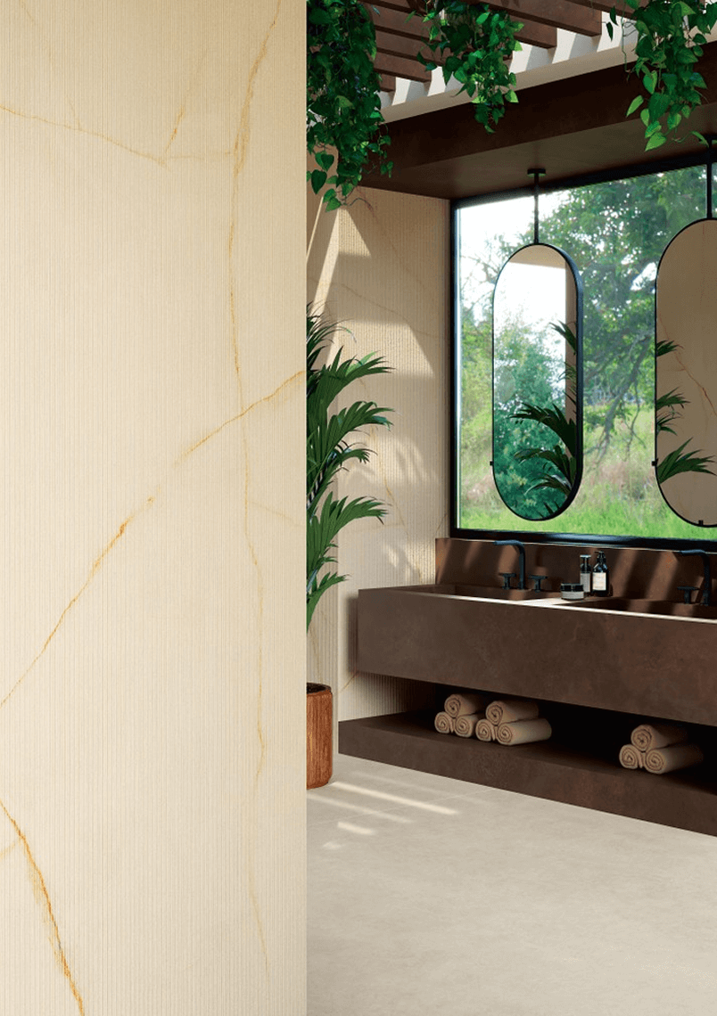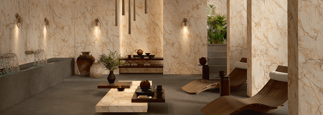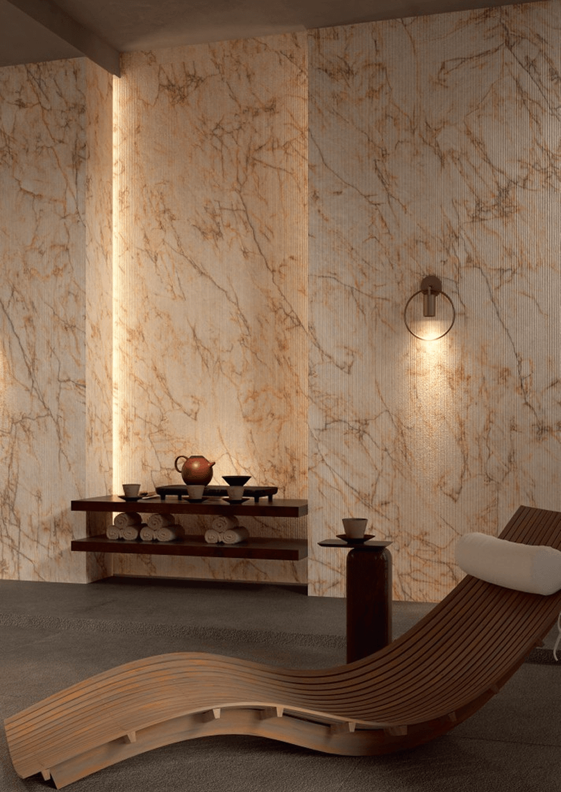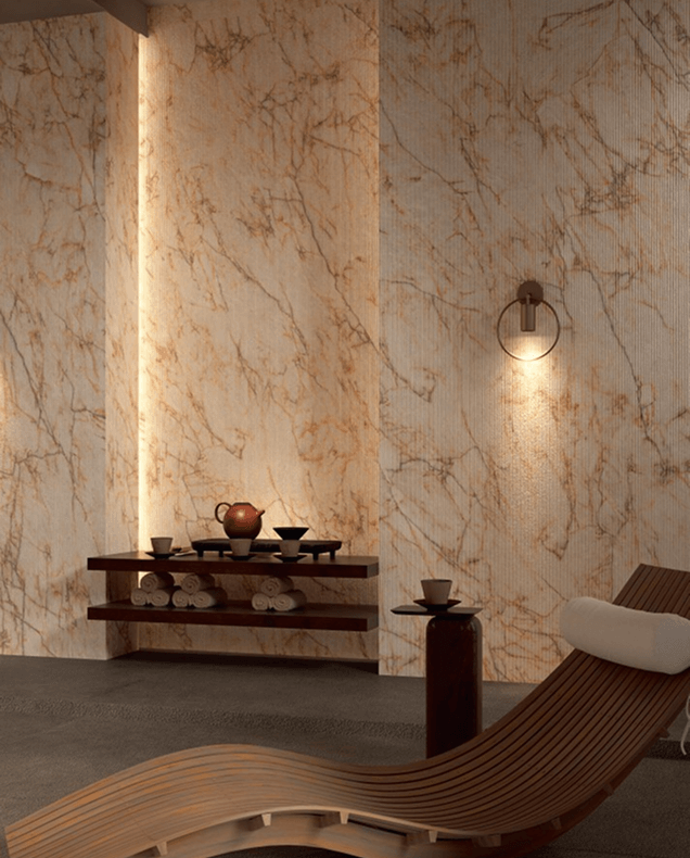 4. Spektakularne możliwości aranżacyjne – podświetlane onyksy tworzące ściany w gabinetach masażu, mozaiki z marmuru zdobiące niecki basenów czy wielkoformatowe spieki kwarcowe Laminam imitujące egzotyczne drewno w strefach wypoczynku. Materiały z oferty Interstone pozwalają kreować przestrzenie o wyjątkowym charakterze, wspierając filozofię danego miejsca – od minimalistycznych spa inspirowanych japońskim zen po bogato zdobione łaźnie nawiązujące do tradycji hammamu. Kolekcje Laminam, takie jak I Naturali (imitujące kamienie naturalne), Legno Venezia (inspirowana drewnem) czy Ossido (z efektem metalu), oferują nieograniczone możliwości projektowe. W przypadku spieków można także łączyć różne wykończenia tego samego dekoru, tworząc interesujące kontrasty wizualne i dotykowe.