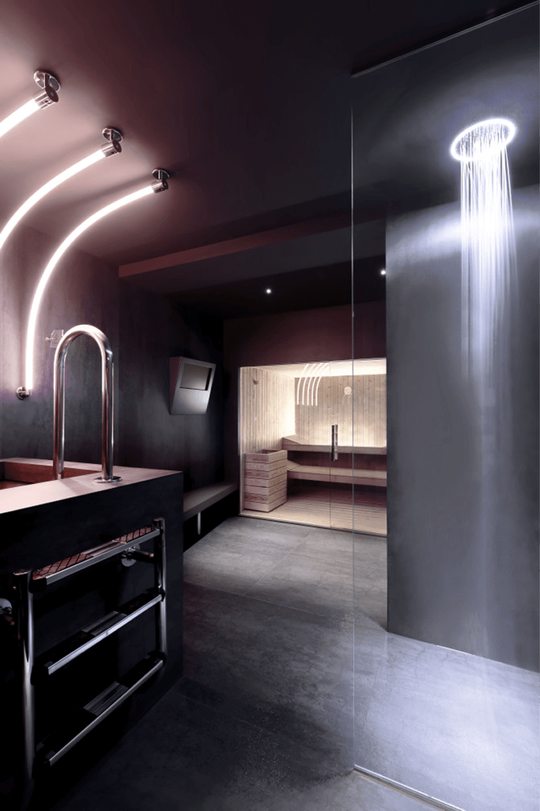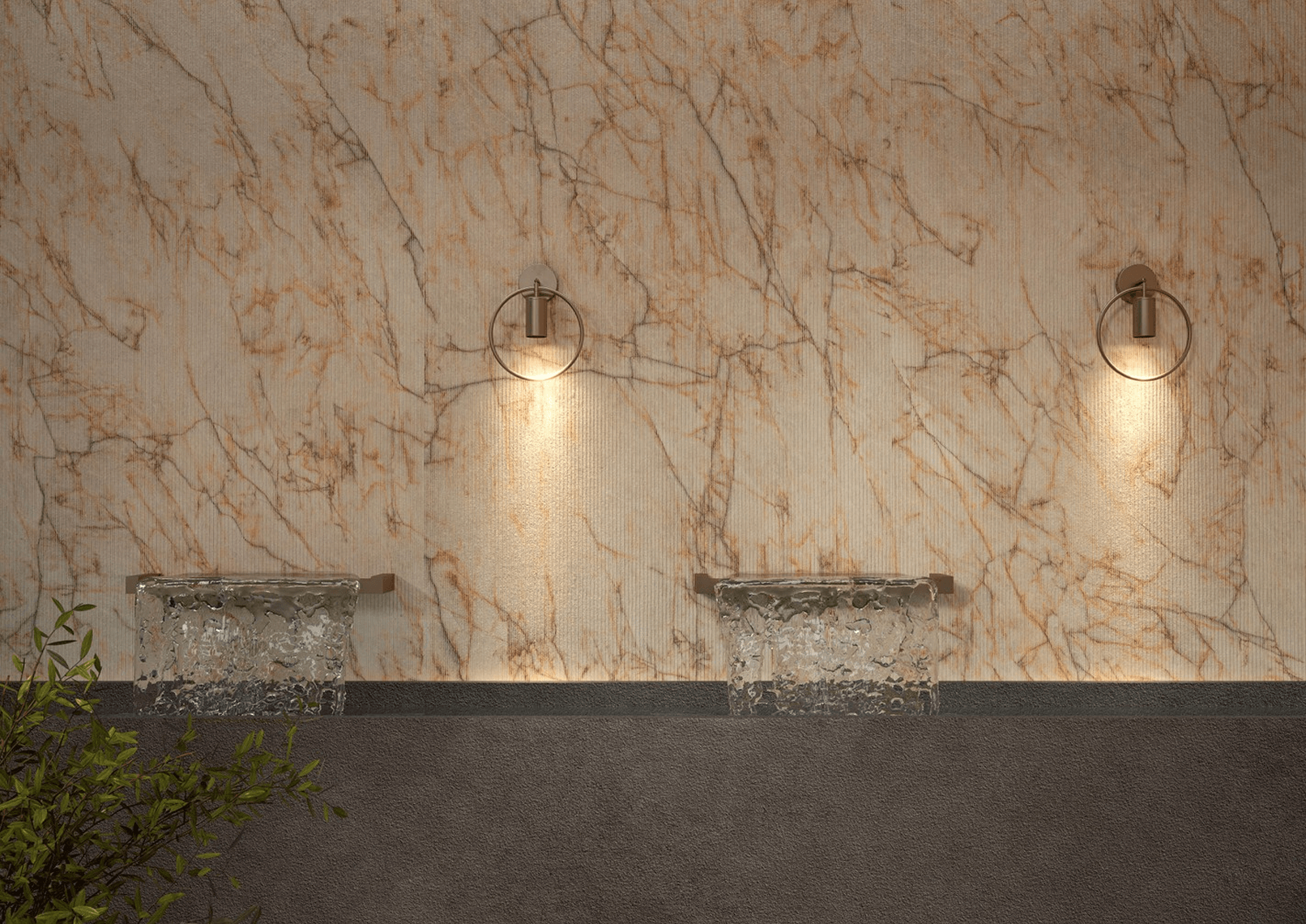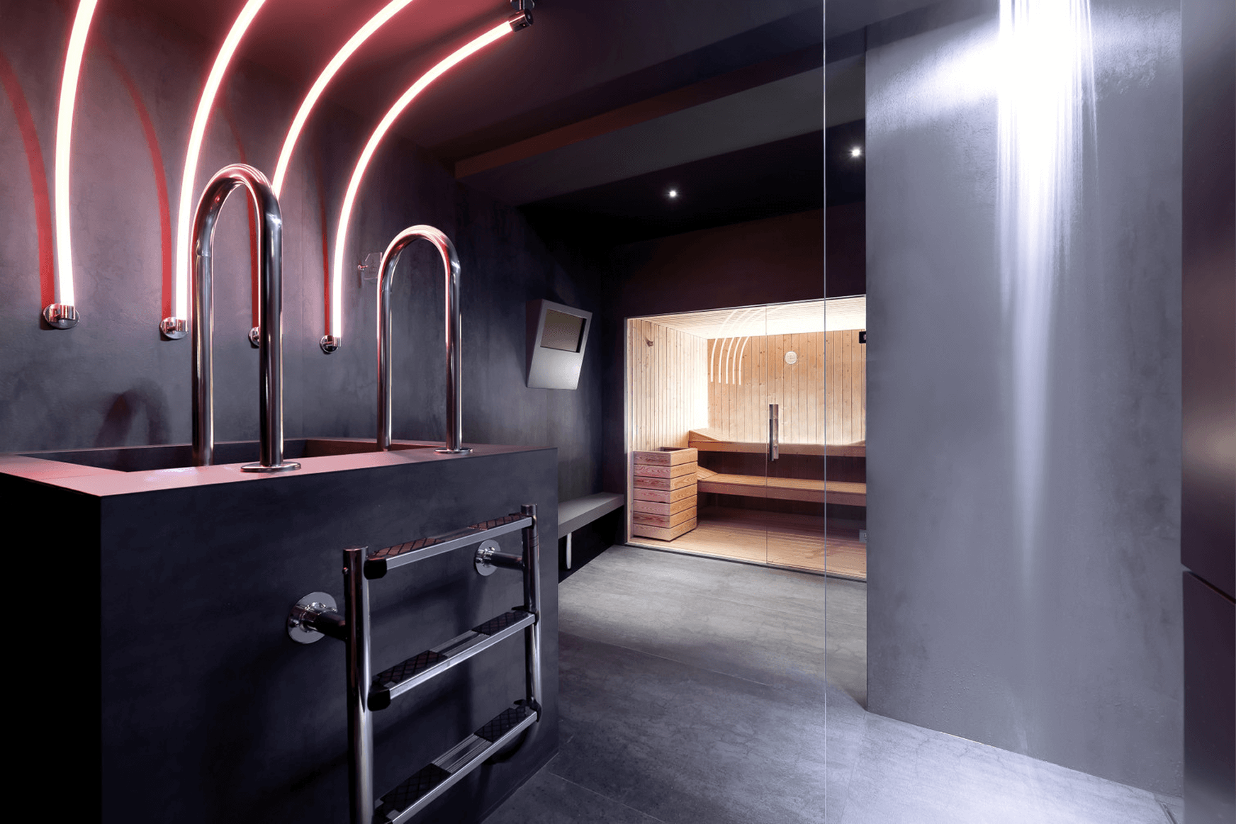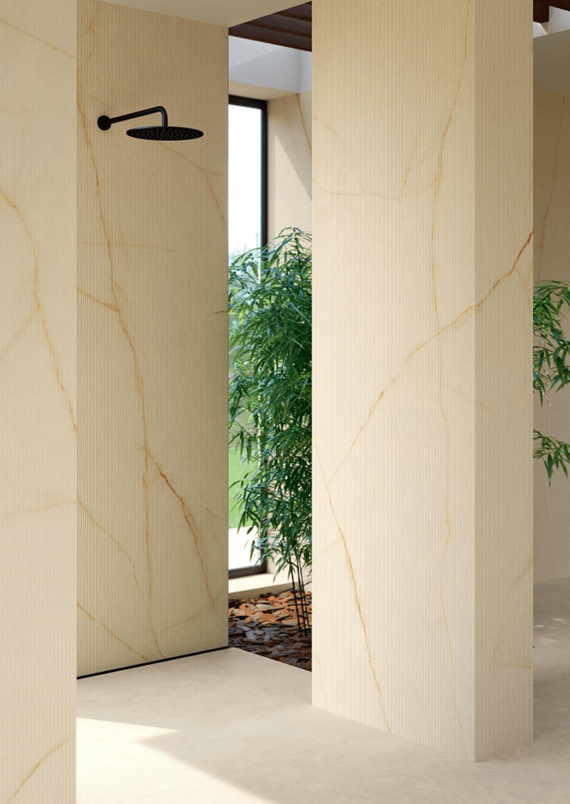 1. Naturalna regulacja wilgotności – kamień oddycha, absorbując nadmiar wilgoci i oddając ją, gdy powietrze staje się zbyt suche. Ta właściwość jest nieoceniona w strefach spa, gdzie poziom wilgotności dynamicznie się zmienia. Marmury i trawertyny tworzą przyjazny mikroklimat, zapobiegając rozwojowi pleśni i grzybów, jednocześnie utrzymując optymalny poziom komfortu dla użytkowników. Spieki kwarcowe Laminam, dzięki swoim właściwościom antybakteryjnym i samooczyszczającym, dodatkowo podnoszą standard higieniczny pomieszczeń wellness. Konglomeraty InterQ, choć przeznaczone wyłącznie do zastosowań wewnętrznych, sprawdzają się doskonale w suchych strefach wellness, oferując jednolitą strukturę bez mikroszczelin, w których mogłyby rozwijać się bakterie.